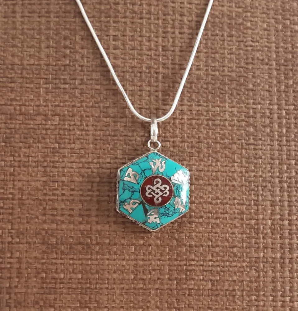 Cordão & Pingente Dodge & OM Tibetano. Prata 925. Turquesa e Coral Tibetano Vermelho. Circunferência: 2 cm. Cordão esticado: 46cm. Entrega imediata.
