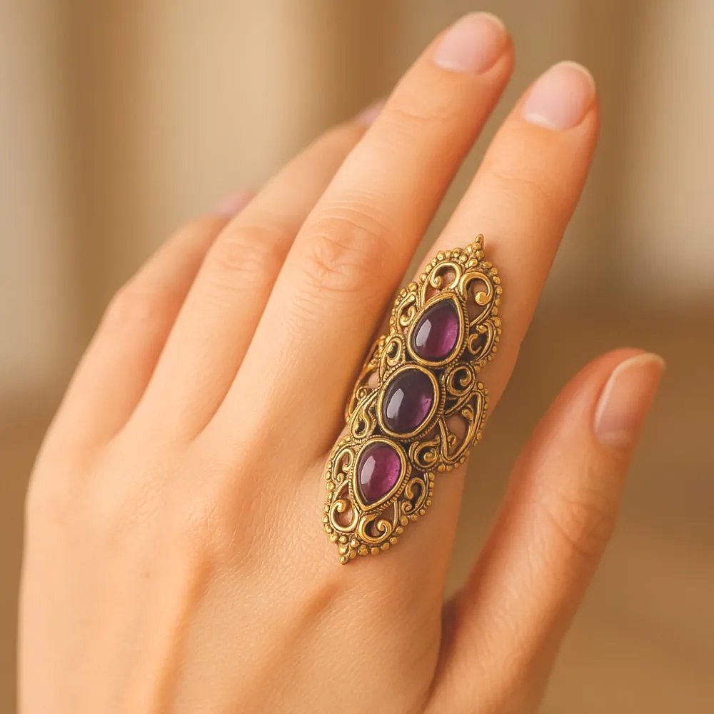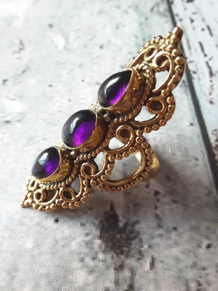 Anel Arabescos com 3 pedras Ametista. Comprimento: 5cm. Tamanho 20. Tirupati Arts New Delhi - India