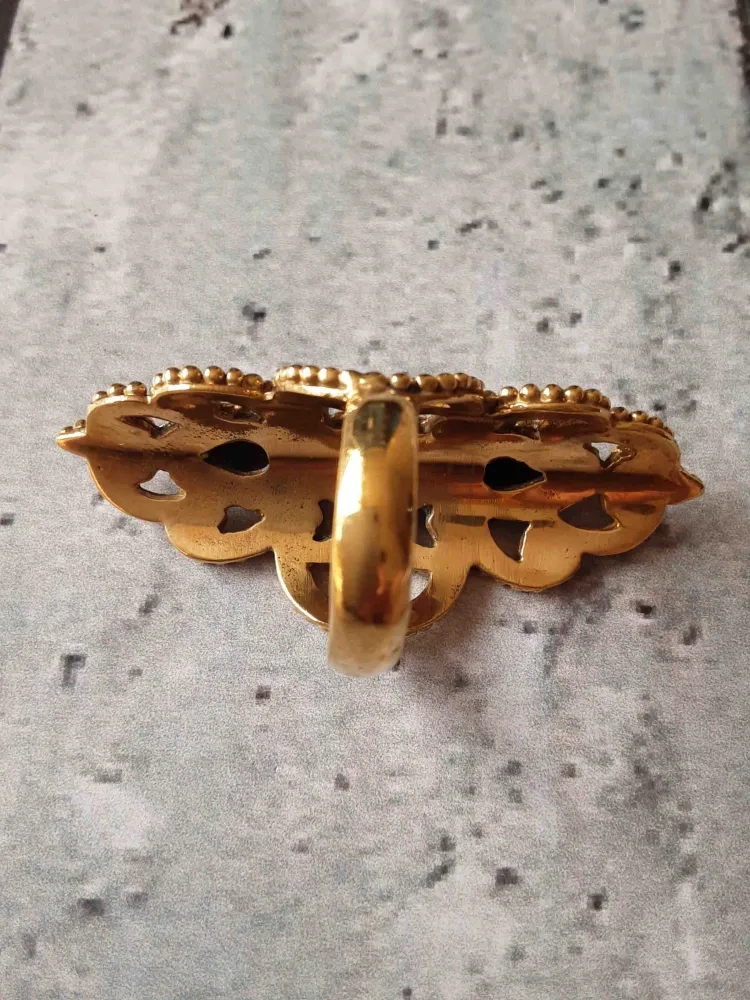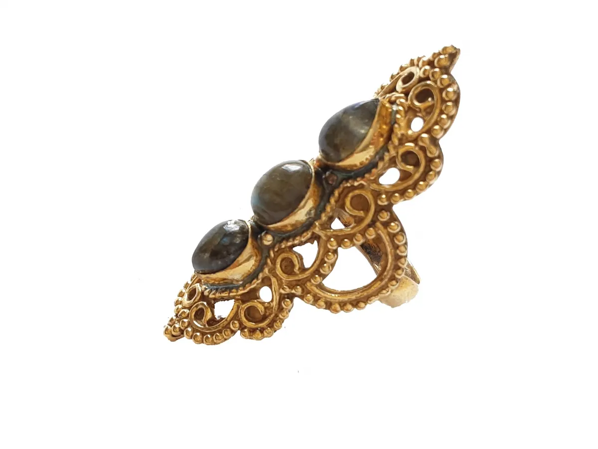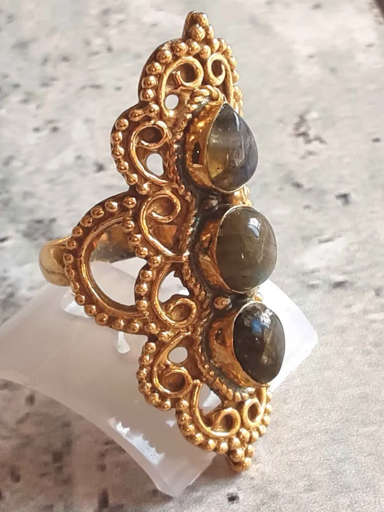 Anel Arabescos com 3 pedras Labradorita. Comprimento: 5cm. Tamanho 21. Tirupati Arts New Delhi - India