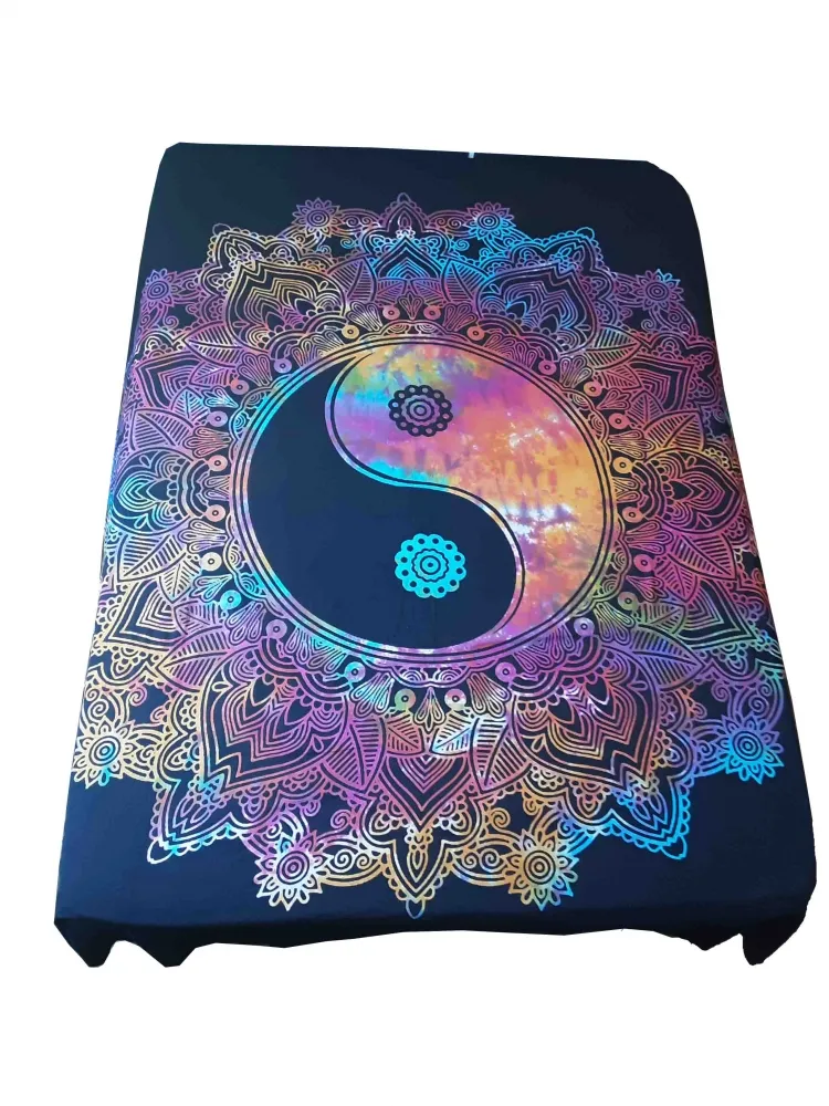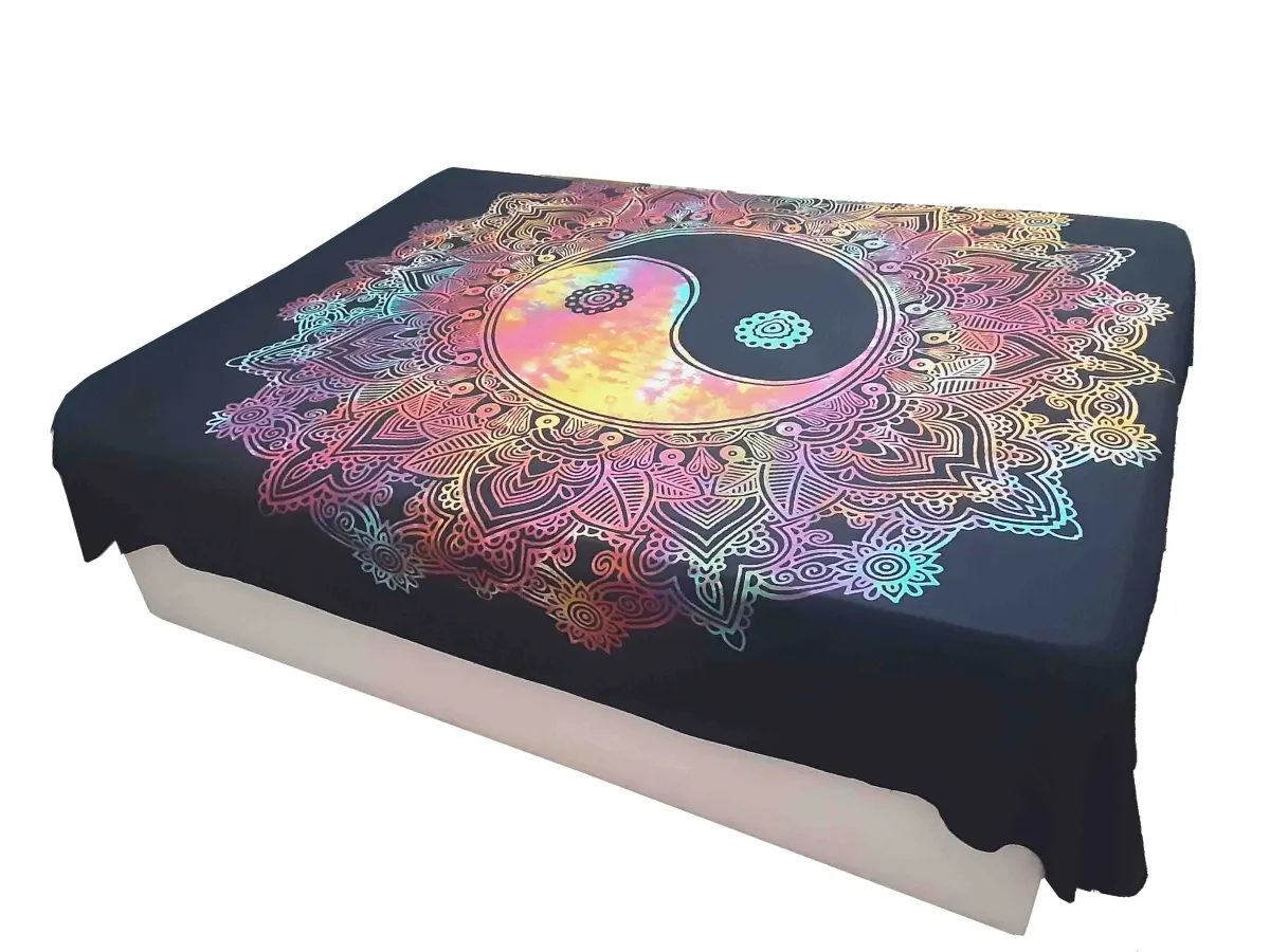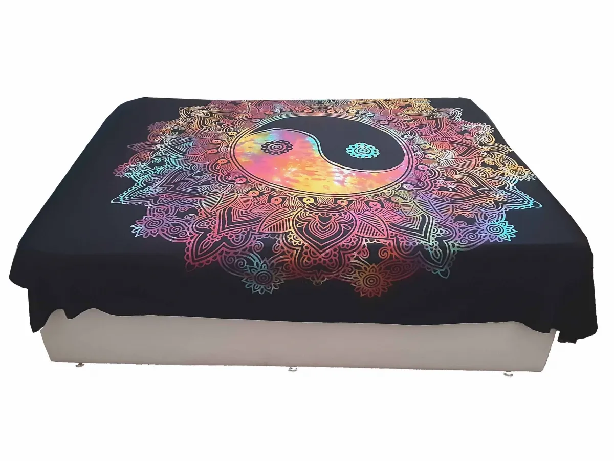 Colcha Yin Yang Lótus em algodão. Medidas: 232cm x 212cm. Pode conter pequenos defeitos de estampa pois é feita à mão.