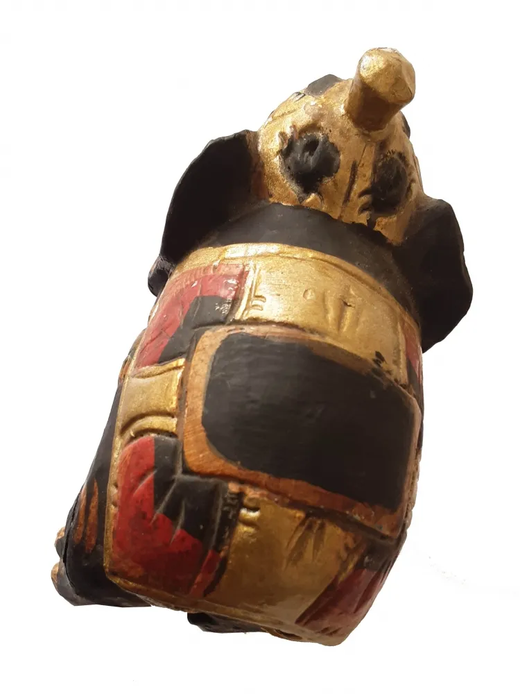 Elefante indiano de madeira feito a mão. Ricamente entalhado e policromado, decorado com folha de ouro  e com pernas de encaixe.  Medidas: 17cm x 15,5cm