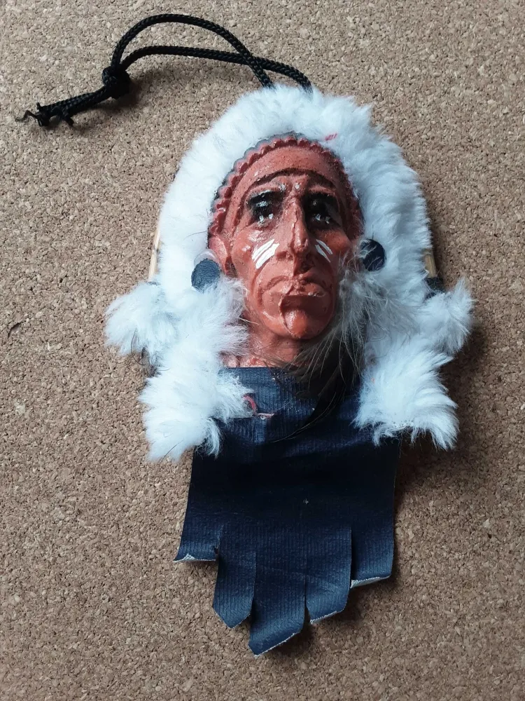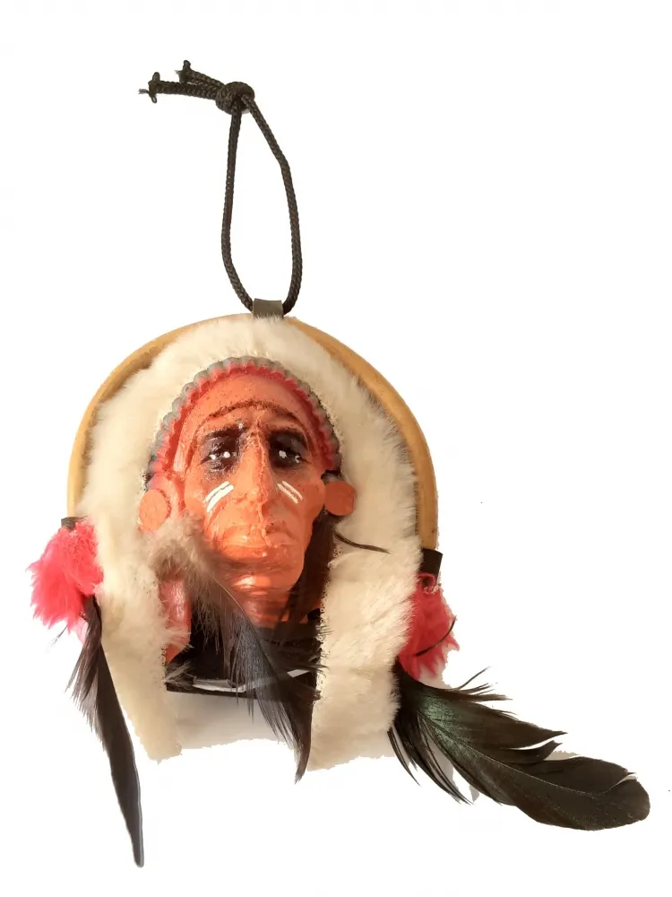 Máscara indio Xamã feita artesanalmente em madeira, plástico e com adornos em tecido e penas sintéticas. Medidas: 12,5cm x 10,5cm.